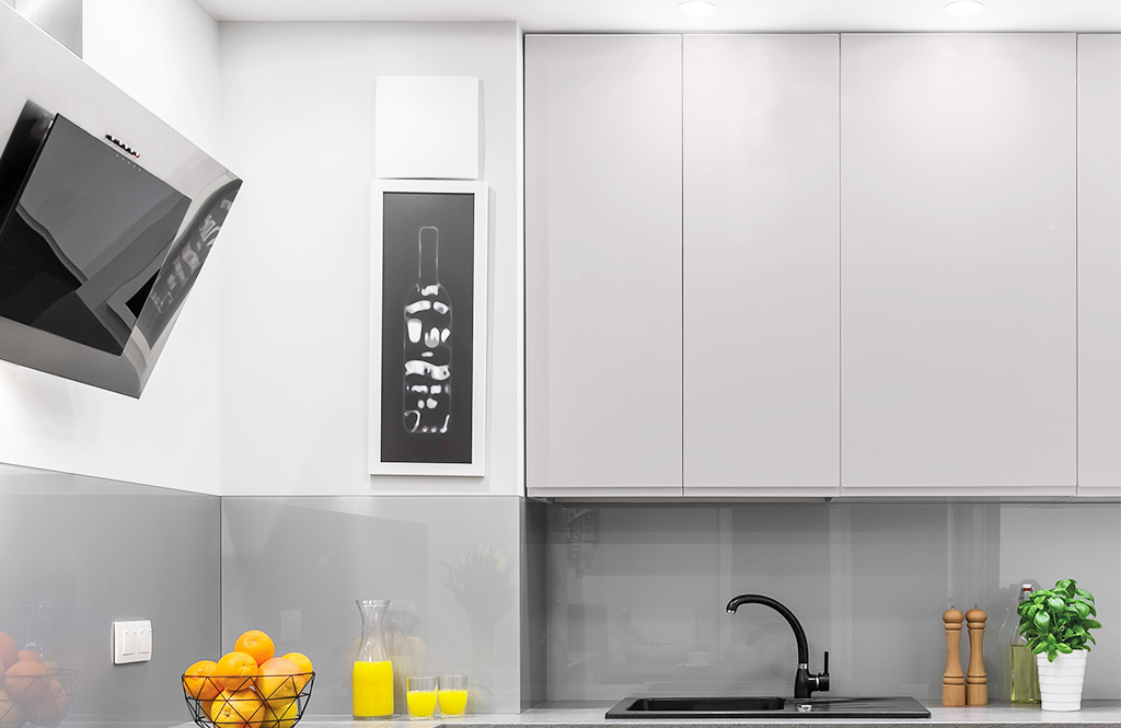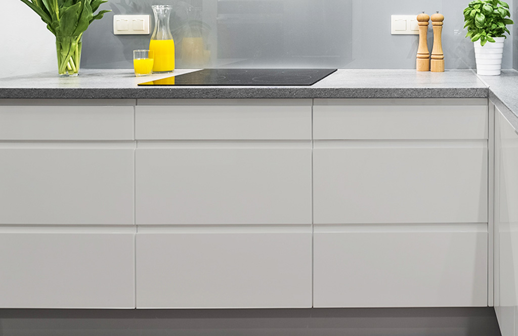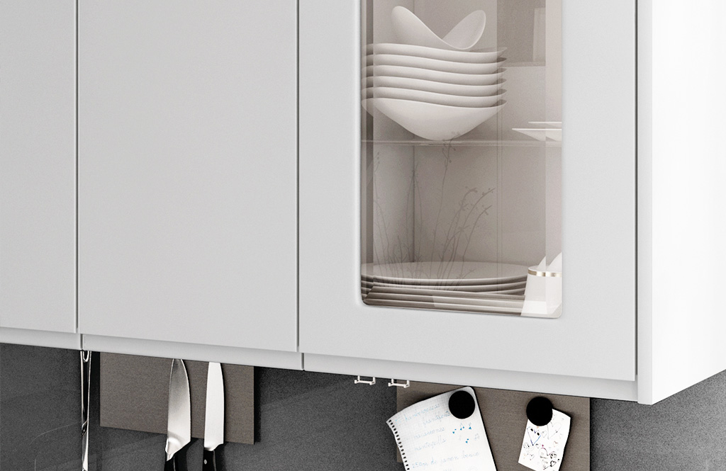 Right up to minute, this handleless door is sophisticated and beautifully minimalist. The light grey painted finish gives a texture and colour which is smooth and matt. The range includes Plain Glass and Curved doors. The glass doors have a nice bevel feature, rounded in the corners to complement the handle profile. Wide drawer frontals look particularly sleek and maximise accessible storage in any sise of kitchen. Tall wall units will also create extra storage space higher up for items not used regularly.