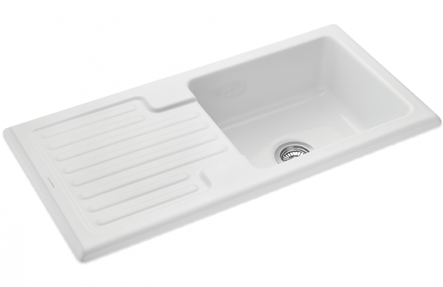 Single Bowl, Inset, Reversible Overall Size 1000 x 500mm Main Bowl 390 x 460 x 198mm Min Base Unit 600mm Material Ceramic White Waste Kits Supplied separately NOTE: 1000mm Min Base Unit with worktops less than 40mm depth