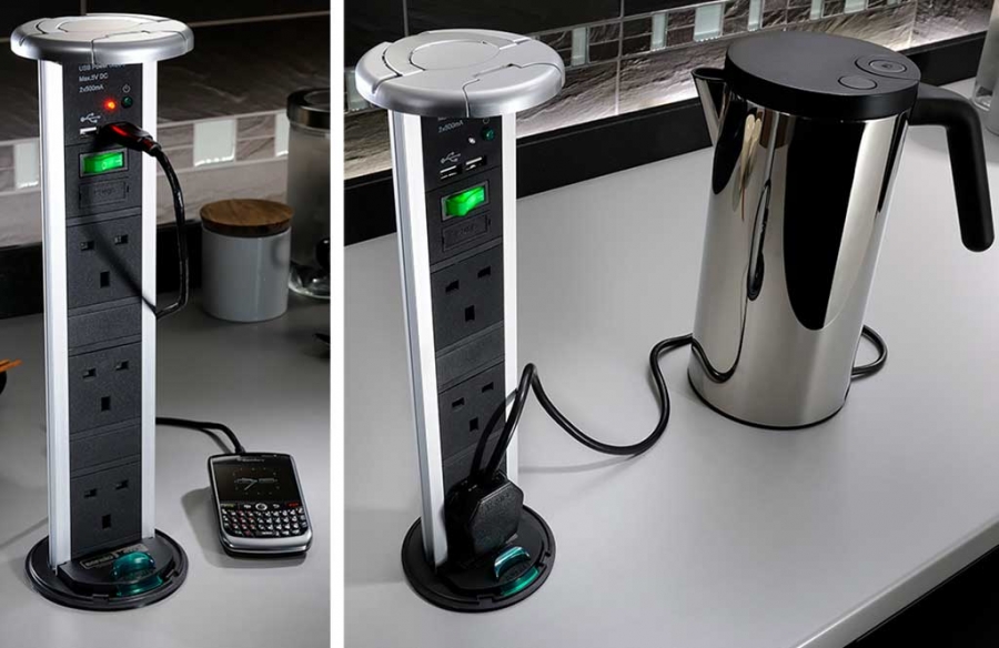 "Retractable sockets and connectivity utilise space efficiency when cleverly located in the redundant spaces of kitchen units. Fit them on islands and peninsulas and even around sinks as they have inbuilt channels to filter splashes away. The handle allows the Power Dock to be pulled up easily and the illuminated neon switch indicates when it’s powered on. Power Docks have USB ports in addition to power sockets and connectivity with the home’s internet router - more functionality in the kitchen."